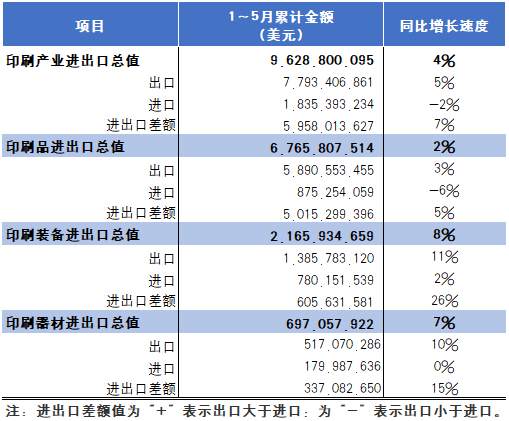 根據(jù)國家海關(guān)總署最新發(fā)布的統(tǒng)計數(shù)據(jù),2024年1~5月國內(nèi)印刷品、印刷裝備、印刷器材進出口總值為96.29億美元(參見表1),與去年同期相比增長4%。