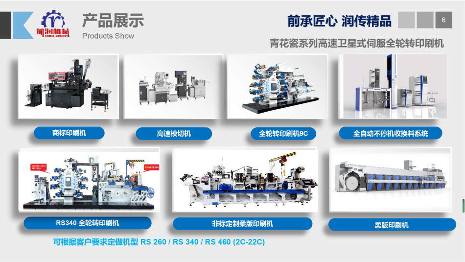 主營設備商標印刷機衛星式輪轉印刷機模切機 等產品,公司可為客戶量身制定商標機、輪轉機等自動化解決方案。公司有強大的研發體系,確保能為客戶量身定制各類非標且最有價值的產品;前潤機械在國內外擁有極高的市場占有率及良好的信譽,贏得了眾多知名企業的青睞與合作,產品暢銷多個國家和地區,市場銷量近萬臺;我們愿與您攜手合作,建立長久雙贏機制,共享成功喜悅!加盟熱線:133 2260 8282
