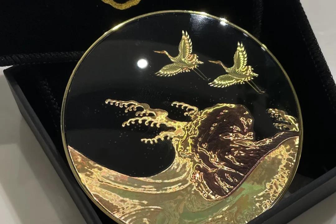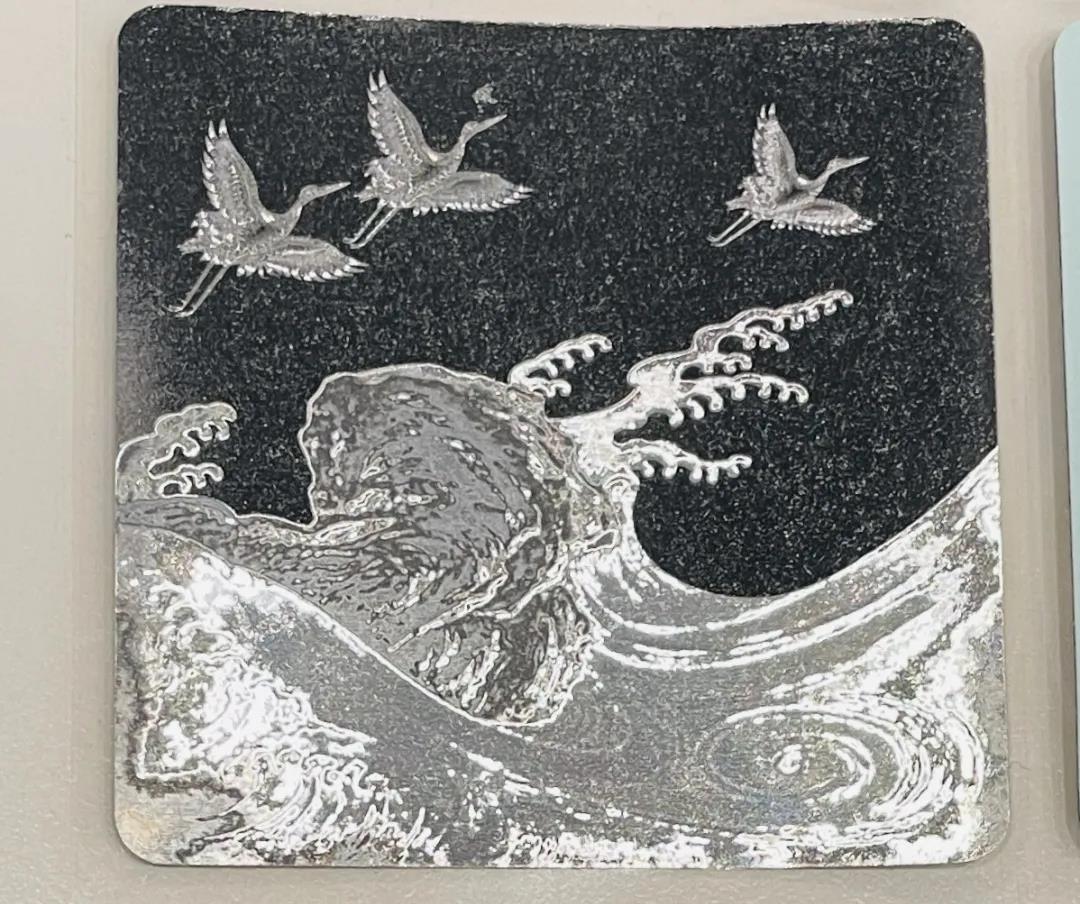 故宮合作的這款標簽,使用了定制圖案棱鏡效果的不干膠貓眼原材料,再進行定位4色印刷,還原了設計圖案中仙鶴和海浪的層層細節。